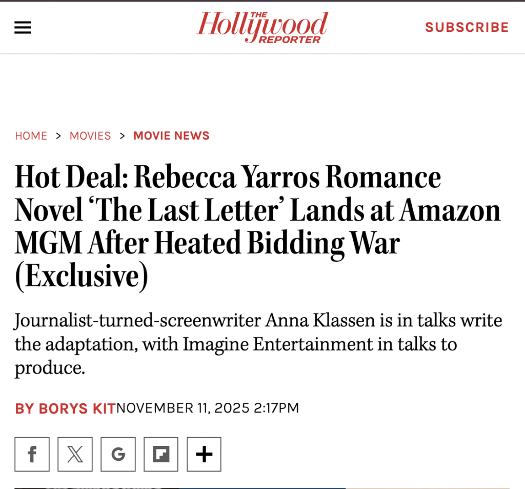 L’information est tombée il y a peu : Amazon MGM Studios a officiellement acquis les droits d’adaptation de The Last Letter de Rebecca Yarros, à l’issue d’une compétition entre plusieurs studios. Le projet est désormais en développement sous la forme d’un long-métrage, non d’une série, avec la promesse d’une adaptation fidèle à l’émotion brute du roman.